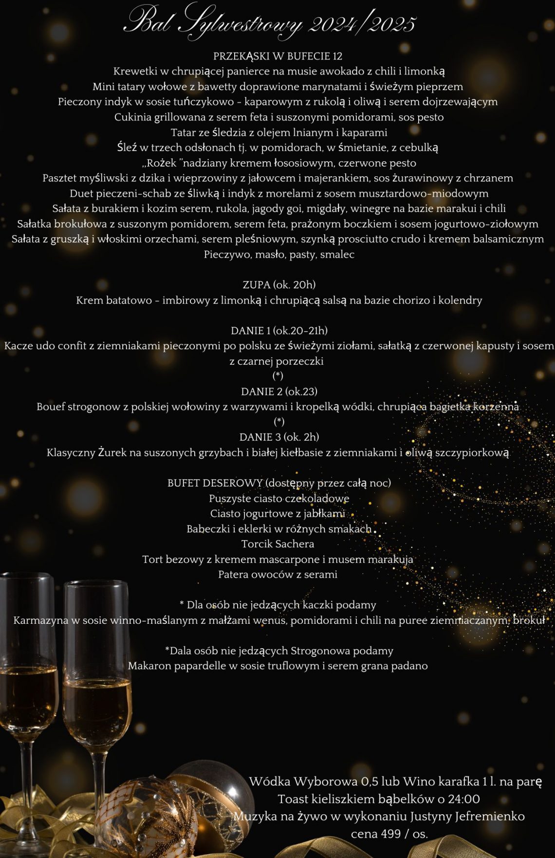 Przywitajmy wspólnie Nowy Rok 2025 w wyjątkowej atmosferze, pełnej wykwintnych smaków, dobrej muzyki i niezapomnianych wrażeń.
