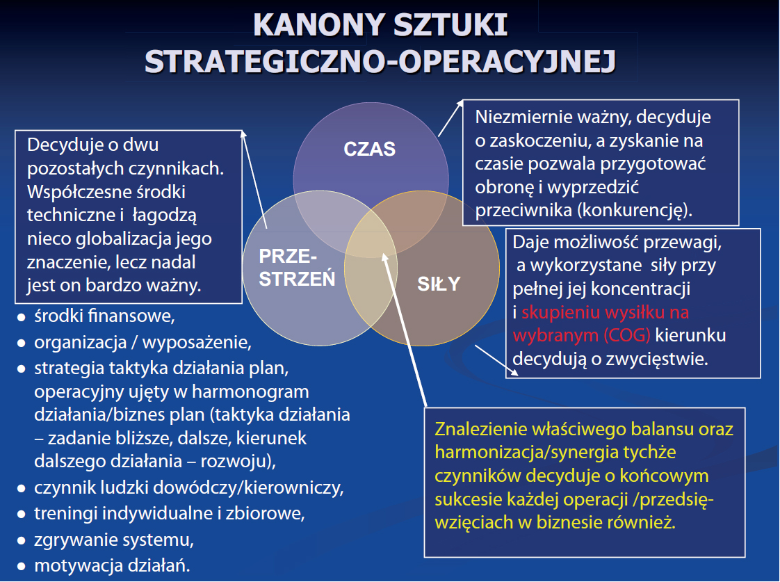 W odpowiedzi na to pytanie posłużę się slajdem obrazującym proces i kryteria podejmowania decyzji w biznesie i w wojsku. Widzimy tutaj, że po zatwierdzeniu decyzji i wydaniu rozkazu do wykonania zadań, podwładny ma swobodę jego realizacji w ramach jasnego celu do osiągnięcia. Jednocześnie przełożony kontroluje osiągnięte rezultaty i reaguje na niedociągnięcia. Wymaga to jednak dużej dozy wzajemnego zaufania, jasno wytyczonych celów, odpowiedniego współdziałania i wsparcia w razie potrzeby. Nowoczesne systemy i środki dowodzenia oraz ustanowione procedury od dawna pozwalają prowadzić operacje wojskowe z dala od stanowisk dowodzenia wyższego szczebla, dając swobodę działania dowódcom niższego szczebla w ramach określonego zamiaru i celów do osiągnięcia.